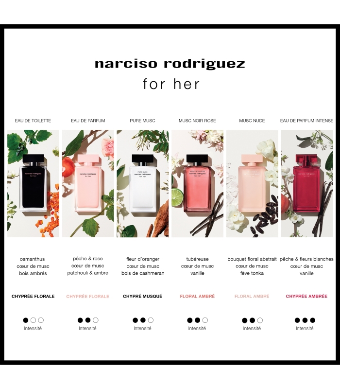 Un coeur de musc exalté par trois facettes : florale-fruitée, boisée, ambrée.