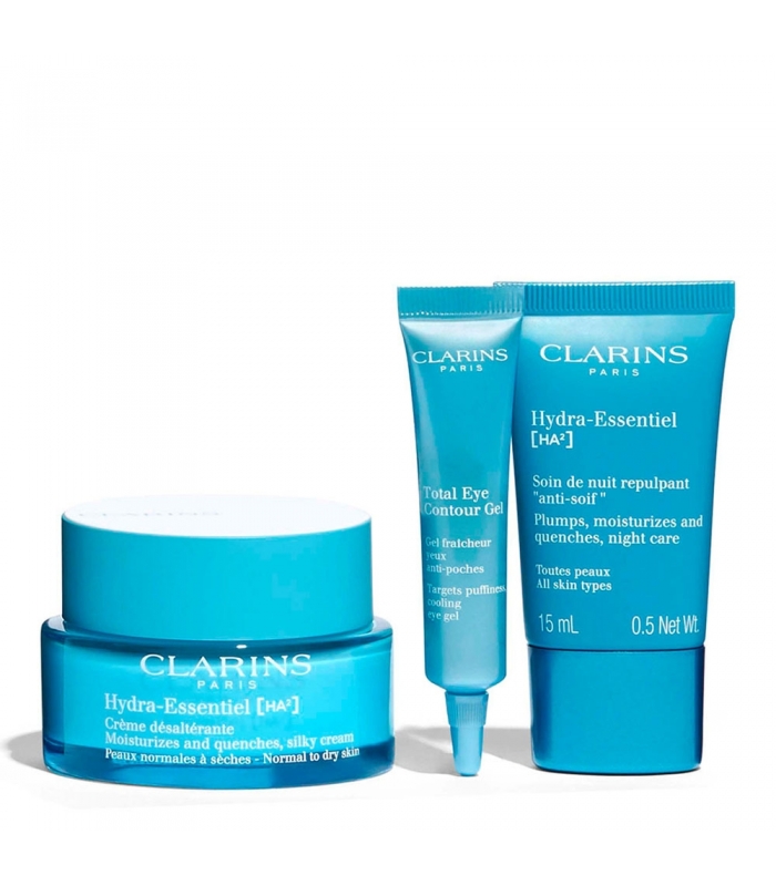 La crème jour Hydra-Essentiel hydrate et repulpe la peau du visage, pour compléter la routine, appliquez le soin Nuit Hydra-Essentiel, régénérant pour une peau éclatante au réveil. Ce duo Jour & Nuit Hydra-Essentiel [HA]2 est enrichi en acide hyaluronique et extrait de kalanchoé officinal bio pour hydrater et repulper intensément la peau : une texture fraîche et soyeuse pour réveiller la peau et une texture plus onctueuse et confortable pour faire de doux rêves. Intensément désaltérée, la peau est fraîche, douce et pulpeuse. Et pour finir lLe soin regard Total Eye Contour Gel aide à diminuer l'apparence des cernes et des poches. Ultra-léger, très frais, il est parfait pour éclairer et reposer le regard. Formulé avec de la caféine végétale, ce soin aide à lutter contre les signes de la fatigue : votre regard retrouve de l'éclat !