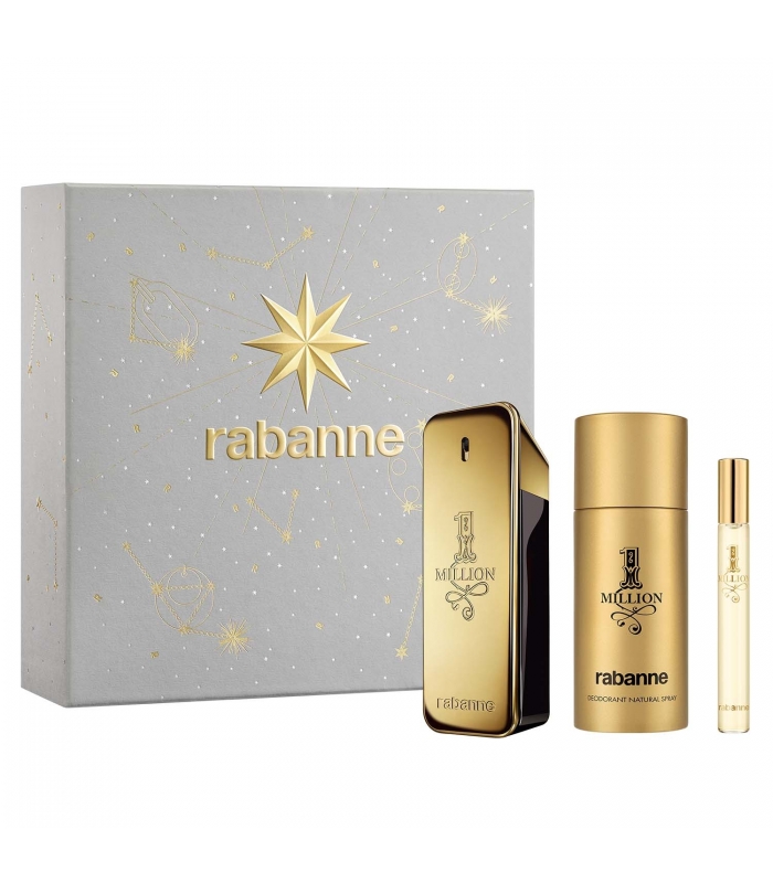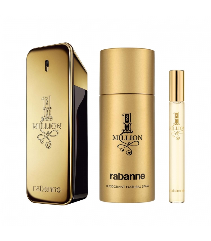 Découvrez 1 Million Eau de Toilette 100ml avec le Déodorant Spray 150ml et le vaporisateur de voyage 10ml, avec une signature ""ambre-cuir"". Bois blanc, cuir blond matiéré, ambre, patchouli sexy pour des fêtes éclatantes.