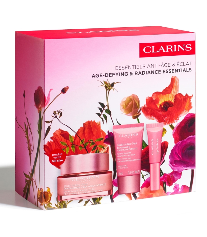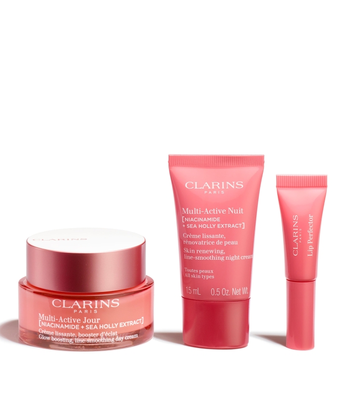 Ce coffret offre la routine soin complète pour les femmes qui souhaitent atténuer l'apparence de leurs premières rides. La crème Multi-Active Jour formulée avec un duo puissant [niacinamide + extrait de chardon des dunes] aide à réduire les 1ers signes visibles de l'âge. Pour compléter votre routine, la Crème Multi-Active Nuit favorise une peau éclatante au réveil : la nuit est le moment optimal pour favoriser le renouvellement de la peau. Ce rituel soin contribue à hydrater la peau tout en préservant sa jeunesse. Un Lip Perfector vient compléter cette routine, touche beauté parfaite pour colorer délicatement les lèvres d'une teinte rose et repulpe instantanément.
