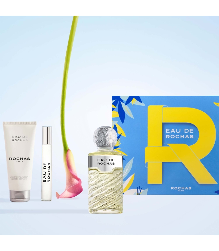 Ce coffret contient une Eau de Rochas 100ml, un Vaporisateur de Voyage 20ml ainsi qu'un Lait Corps 100ml.