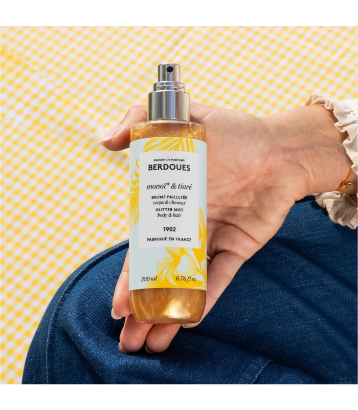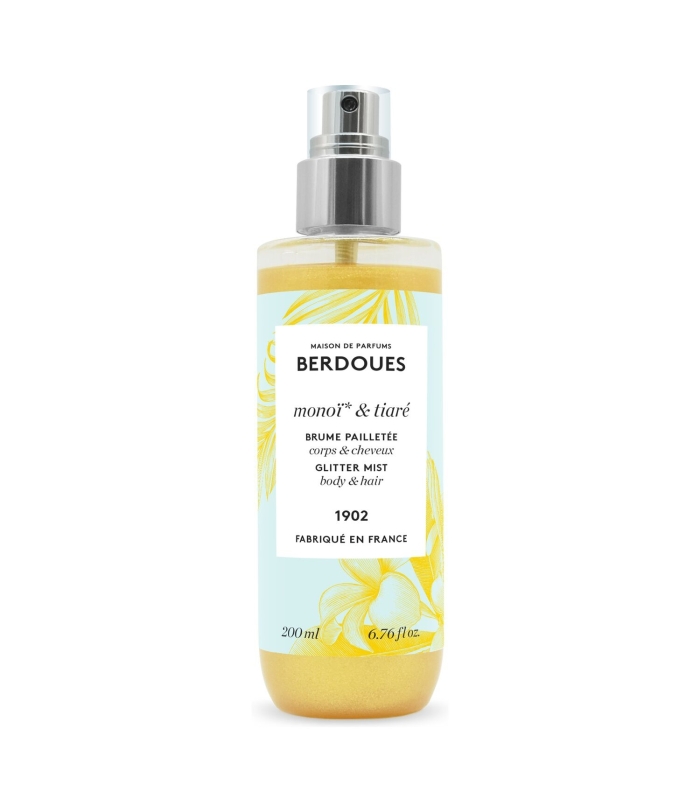 Parfumée avec l’iconique eau de toilette Monoï Tiaré, la Brume pailletée sublime votre peau, vos cheveux et vos vêtements d’un voile pailleté doré.